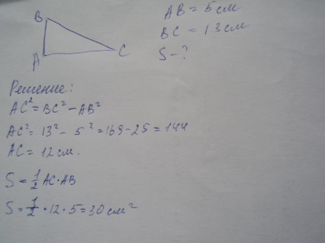 Катет прямоугольного треугольника равен 5 см, гипотенуза равна 13см. Найдите площадь треугольника