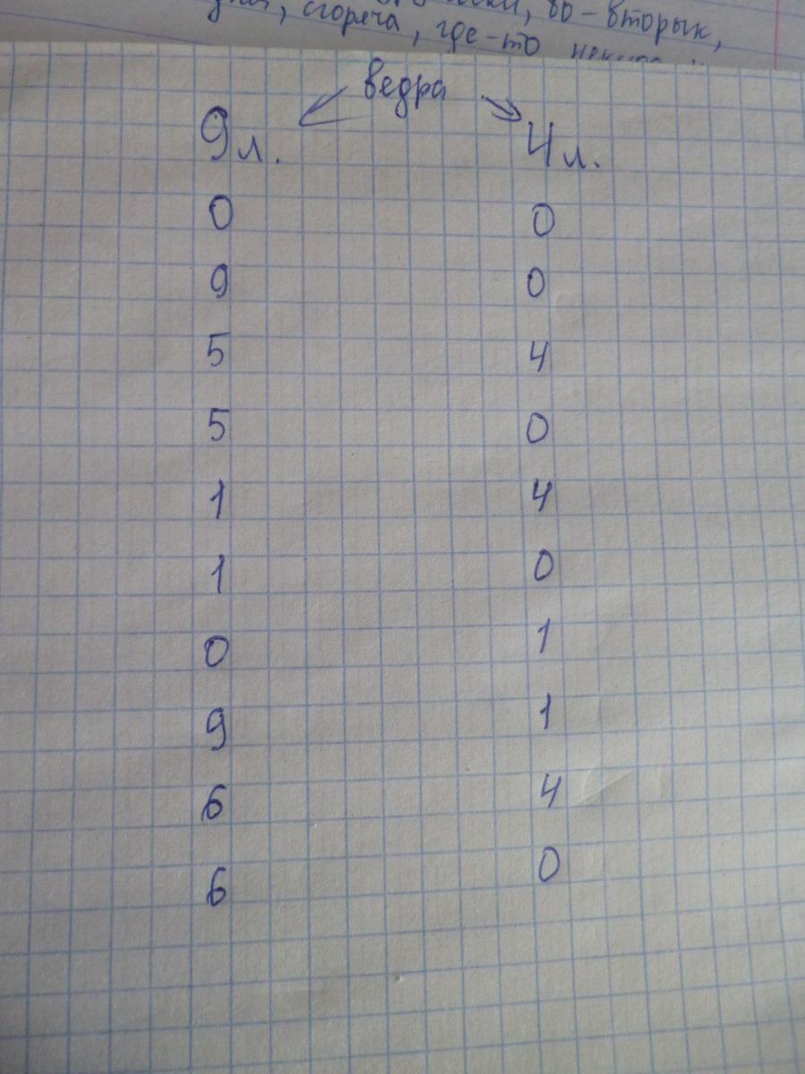 3) Потом я из 9литрового ведра перелила в 4 литровое ведро, и у меня в девятилитровом ведре осталось 5 литров а в 4литровом ведре 4литра