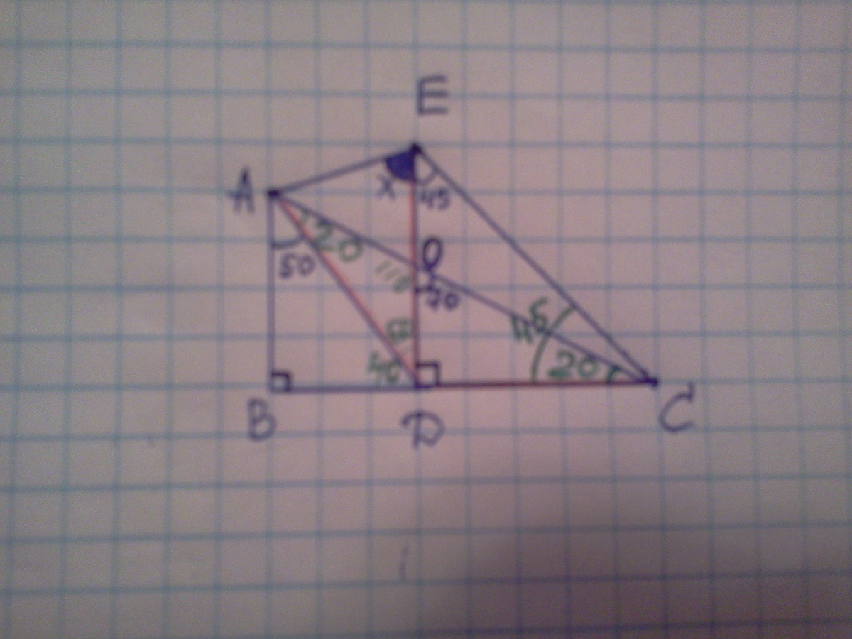В треугольнике abc угол В равен 90 градусов . Из точки D взятой на стороне BC проведен отрезок DE перпендикулярный к BC и пересекающий AC в точке О. DOC = 70 DEC = 45 BAD = 50 найдите угол AED