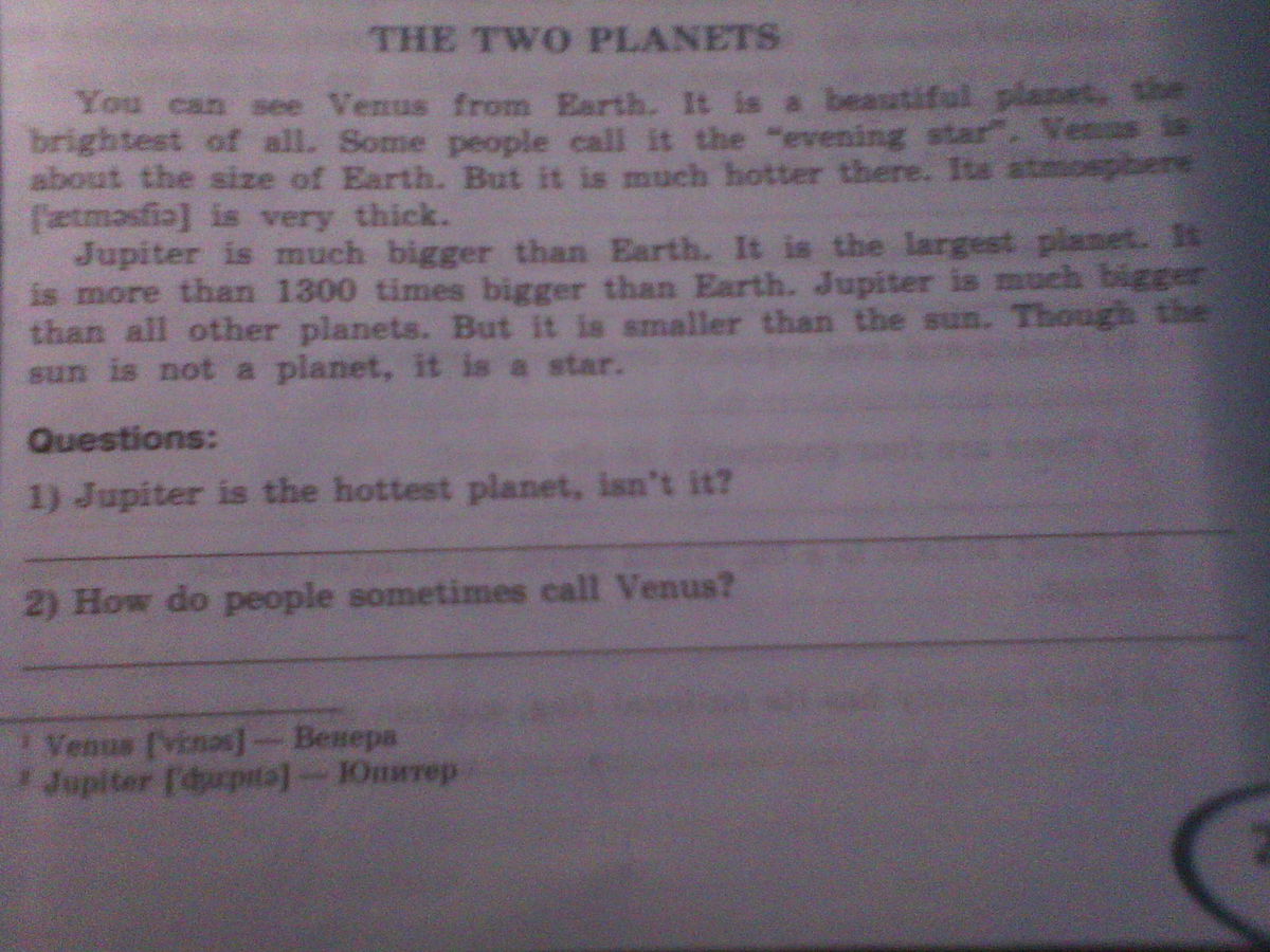 Вы можете увидеть Венеру с Земли.Это красивая планета , самая яркая из всех.Некоторые люди называют Венеру вечерний звездой.Венера примерно такого же размера, как и Земля.Но там более жарко.Атмосфера там очень плотная.