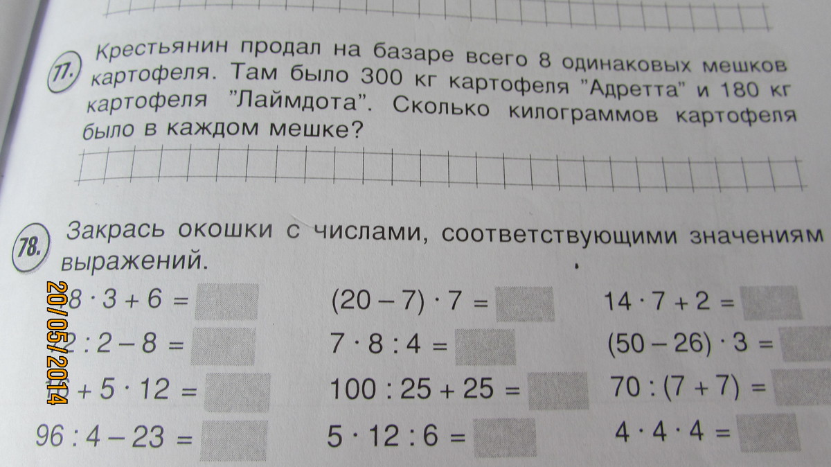 60 кг. Решение:300+180=480 (кг)-всего картошки 480:8=60 (кг)-картошки в каждом мешке