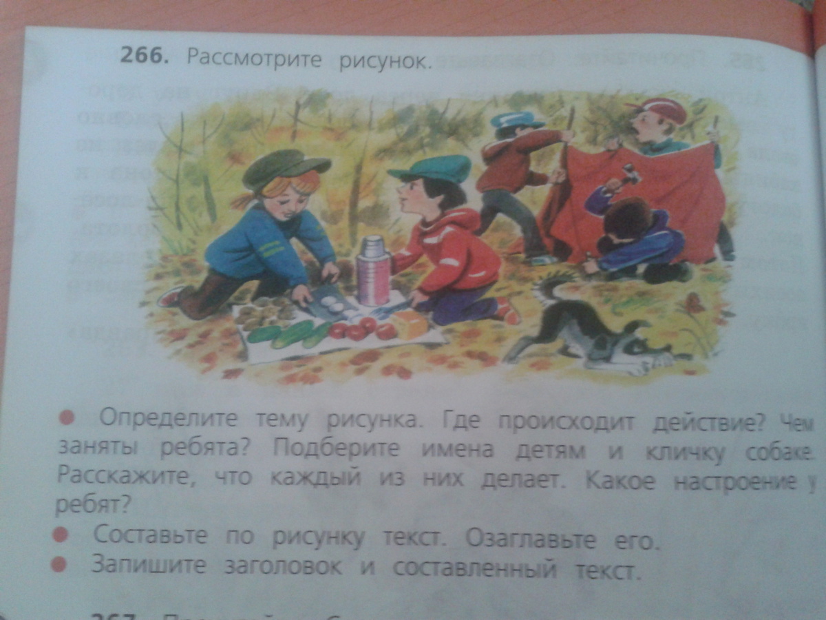 Действия происходят в лесу, на природе. Ребята устроили пикник. Саша и Денис занимаются приготовлением еды, Артем Коля и Миша ставят палатку, вокруг них бегает их любимый пёсик Шарик задорно виляя хвостиком. У всех задорное, веселое настроение. Название текста: "На природе". Как то так:)