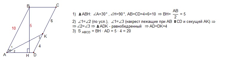 В параллелограмме ABCD угол BAD равен 30 градусов, а его биссектриса АК делит сторону CD на отрезки DК=4, СК=6. Найдите площадь параллелограмма.