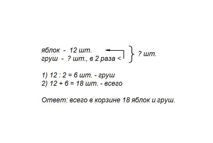 В корзине было 12 яблок, а груш в 2 раза меньше, чем яблок. Сколько всего яблок и груш было в корзине? Кто решит задачу правильно тот молодец.