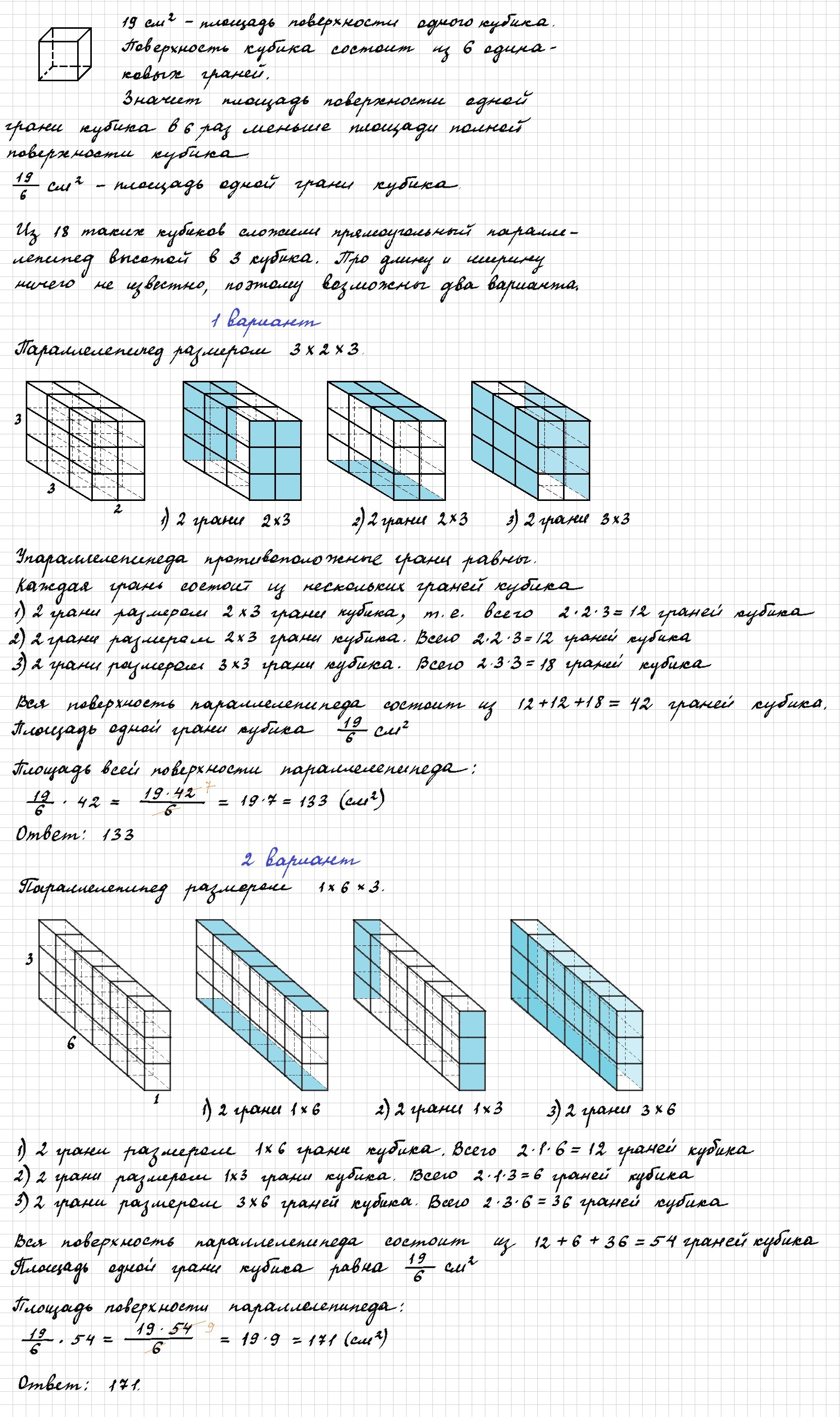 Из 18 одинаковых кубиков сложили прямоугольный параллелепипед высотой в три кубика. Найдите площадь поверхности параллелепипеда, если площадь поверхности одного кубика равна 19 квадратных см. _____________________________________________