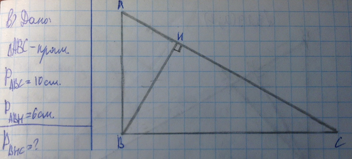 Помогите!!! Есть рисунок!!!! Прямоугольный треугольник, периметр которого равен 10, делится высотой, опущенной на гипотенузу, на два треугольника. Периметр одного, из которых равен 6. Найдите периметр второго треугольника.