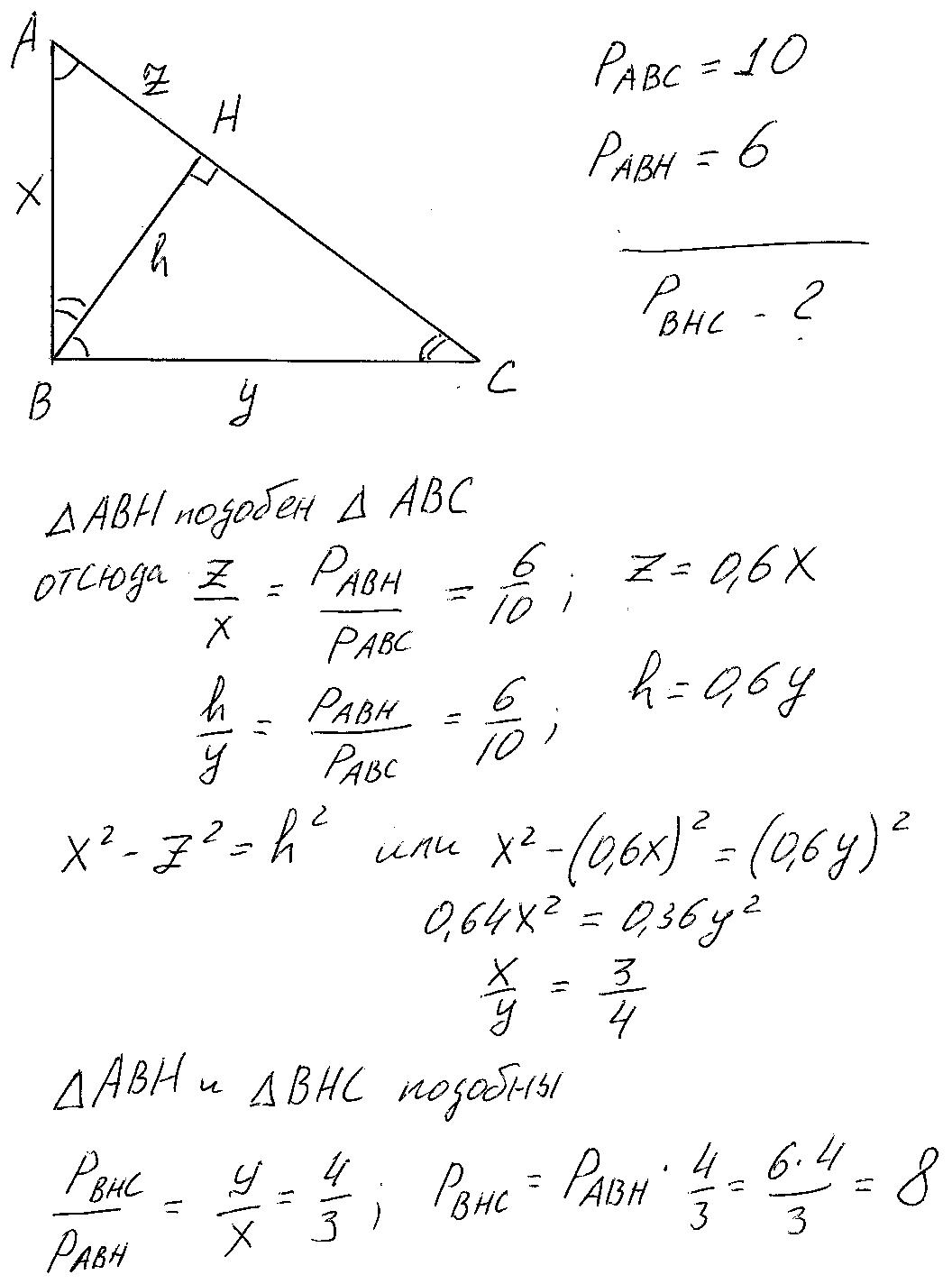 Обозначим стороны треугольников х, у,z, и высоту h (смотри рисунок). Далее исходим из того, что высота h проведённая к гипотенузе, делит прямоугольный треугольник на три подобных треугольника АВС, АВН и ВНС, а также, что отношение периметров подобных треугольников равно отношению сходственных сторон. Окончательный ответ Рвнс=8.