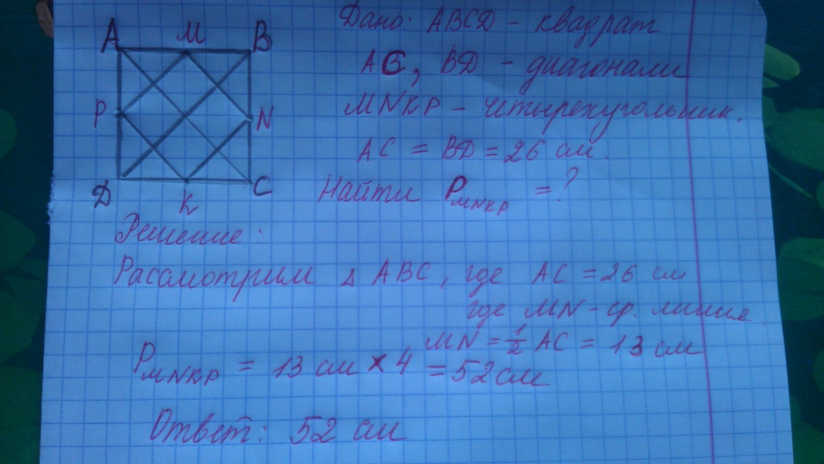 решите пожалуйста хотя бы одно :) 1. диагональ квадрата 26 см. найдите периметр четырехугольника, вершинами которого являются середины сторон квадрата. 2. сумма двух противоположных сторон описанного четырехугольника равна 12 см, а радиус вписанной в него окружности равен 5 см. найдите площадь четырехугольника. решите пожалуйста хотя бы одно :)