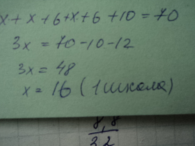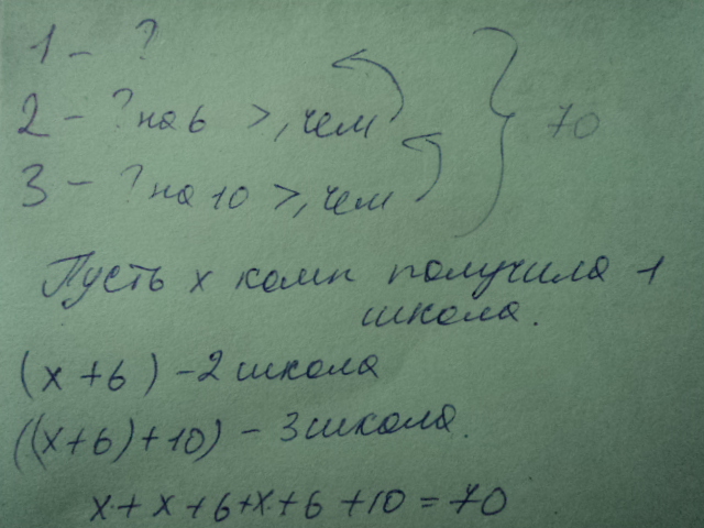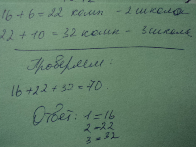 Пусть х компьютеров получила первая школа,тогда вторая получила(х+6) компьютеров,а третья (х+16) компьютеров,по условию всего было 70 компьютеров,составим и решим уравнение: