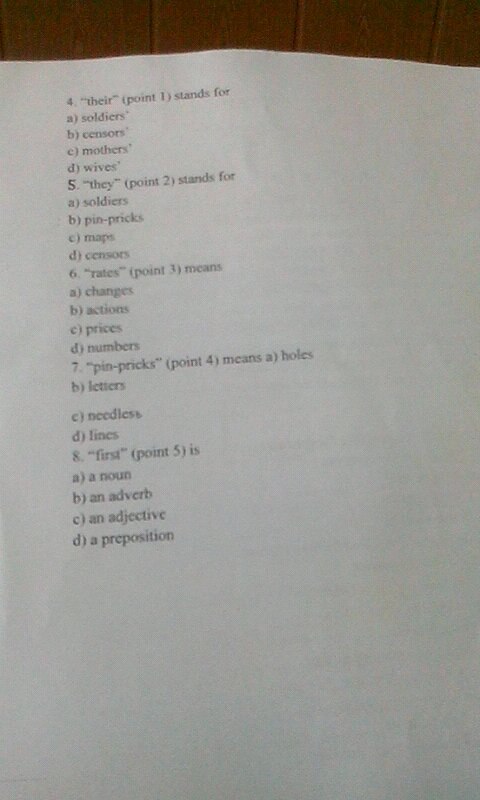 There was a time in time in England when postage rates (3) were very high , Only rates for newspapers were low . People who had little money but a lot of time sent letters to their friends with newspapers .They made very small pin-pricks (4) under letters and wrote large letters in this way Soldiers often used this kind of letter, too, to let their families know where they were. A soldier sent home a map with a pin-prick atthe place of his dislocation. Their (1) mothers or wives beld up those maps to the light and saw where the pin-prick was. The system was not very quickly. They (2) let the maps go through but first (5)they made hundreds of pin-pricks on them to confuse the people who received them.