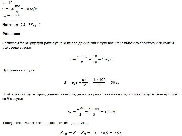 Авто двигаясь равноускорено через 10с после начала движения достиг скорости 36 км в ч определить учкорение с которым двигался авто какой путь он при этом прошол какое растояние прошол за последнию секунду Решение и не обизательно обеснение