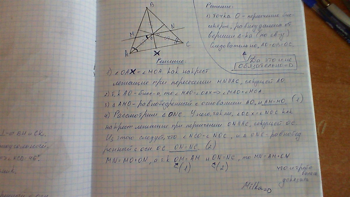 через точку пересечения биссектрис треугольника АВС проведена прямая, паралельная прямой АС, пересекающая сторону АВ в точке М, а сторону ВС - в точке N. Докажите ,что МN=AM+CN
