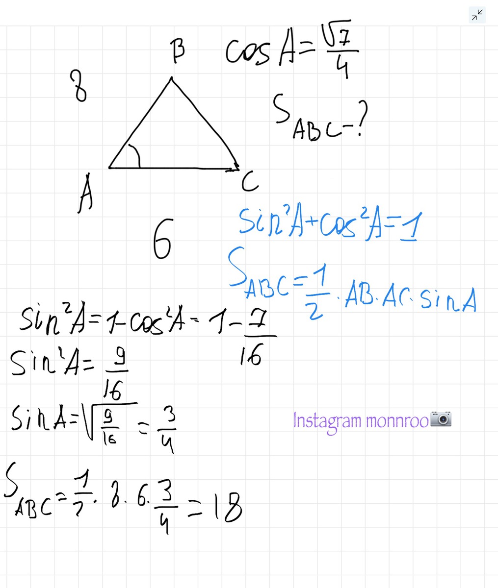 Дан треугольник АВС, АВ=8, АС=6, косинус угла А=корень из 7 делённый на 4, найти площадь треугольника АВС.