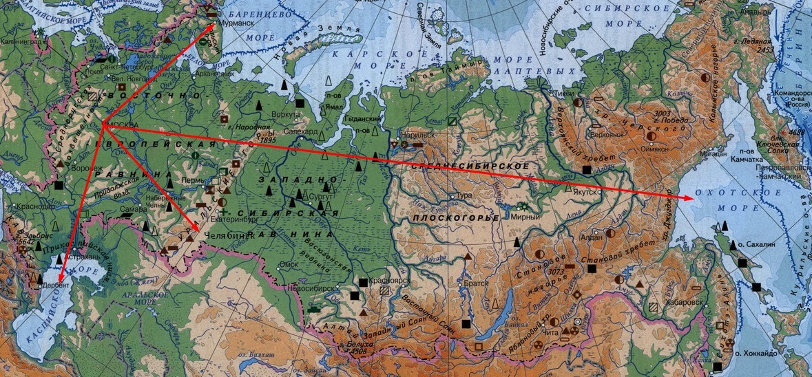 в каком направлении от Москвы находится Каспийское море, г. Челябинск, г. Мурманск, Охотское море???