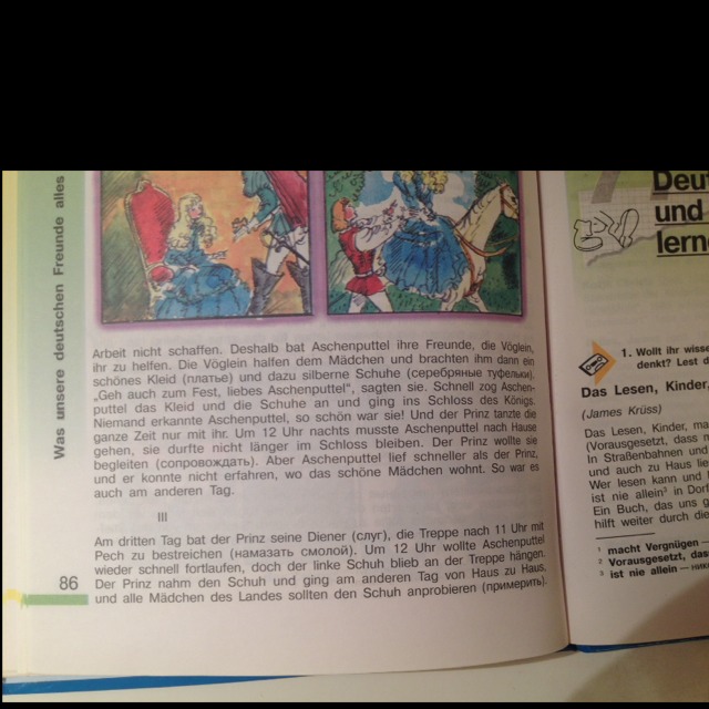 Неродные сестры так же захотели пойти на бал. Они расчесывались, одевали туфли и долго вертелись перед зеркалом. Золушка должна была остаться дома. Ей досталось очень много домашней работы от мачехи. Она должна была, разумеется, сама выполнить эту работу. Поэтому Золушка попросила свою подругу, фею ей помочь. Фея помогла девочке и дала ей красивое платье и серебряные туфли к нему. "Иди на бал, дорогая Золушка" сказала она. Золушка быстро одела платье и туфли и пошла в замок короля. Никто не узнал Золушку, такой красивой она была! И принц танцевал все время с ней. В 12 часов ночи Золушка должна была вернутся домой, она не могла больше оставаться в замке. Принц хотел ее сопровождать. Но Золушка бежала быстрее, чем принц и он не знал, где живет эта красивая девочка. Так было и на другой день.