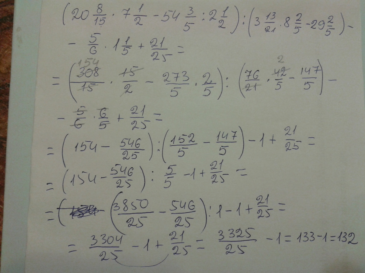 (20 8/15 * 7 1/2 - 54 3/5 : 2 1/2) : (3 13/21 * 8 2/5 - 29 2/5) - 5/6 * 1 1/5 + 21/25.