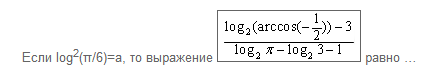 log^2frac{pi}{6}=a; to ; logfrac{pi}{6}=pm sqrt{a}\\frac{log_2(arccos(-frac{1}{2}))-3}{log_2pi -log_23-1}=frac{log_2(pi -frac{pi}{3})-log_28}{log_2frac{pi}{3}-log_22}=frac{log_2frac{2pi }{3cdot 8}}{log_2frac{pi}{3cdot 2}}=frac{log_2frac{pi}{12}}{log_2frac{pi}{6}}=\\=frac{log_2(frac{1}{2}cdot frac{pi}{6})}{log_2frac{pi}{6}}=frac{log_2frac{1}{2}+log_2frac{pi}{6}}{log_2frac{pi}{6}}=frac{-1+log_2frac{pi}{6}}{log_2frac{pi}{6}}=