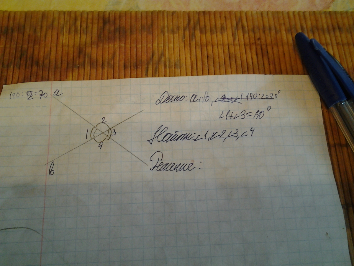 Углы 1 и 3 являются вертикальными, поэтому они равны, то есть каждый равен 140/2=70 градусам. Угол 2 смежный с углом 1, поэтому он равен 180-70=110 градусам. Угол 4 также смежный с углом 1, поэтому он также равен 110 градусам.