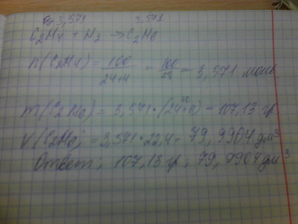 Вычислить массу и объем этана который образуется при гидрировании 100 г. этилена.