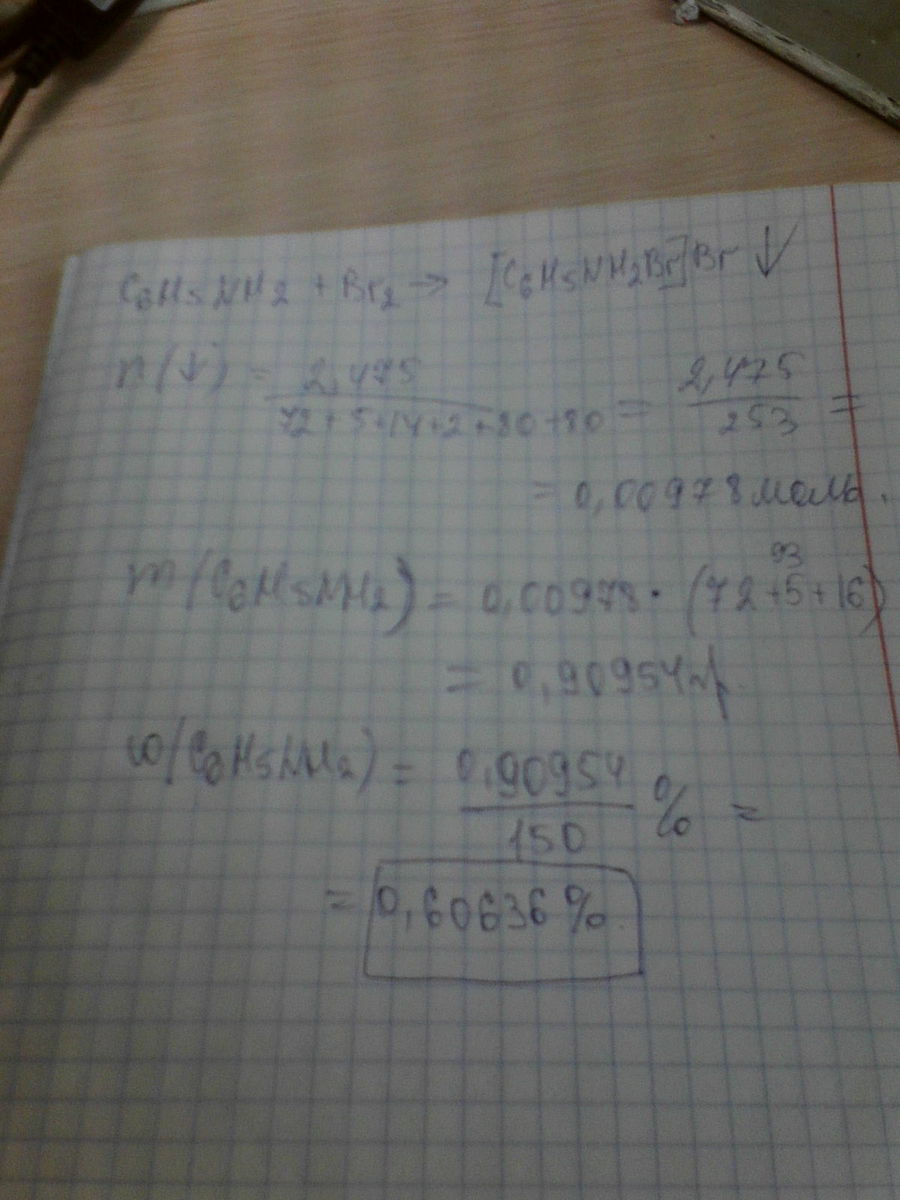 при взаимодействии брома с анилином в орг.растворе массой 150 г выпал осадок 2.475 г. определите массовую долю анилина в растворе
