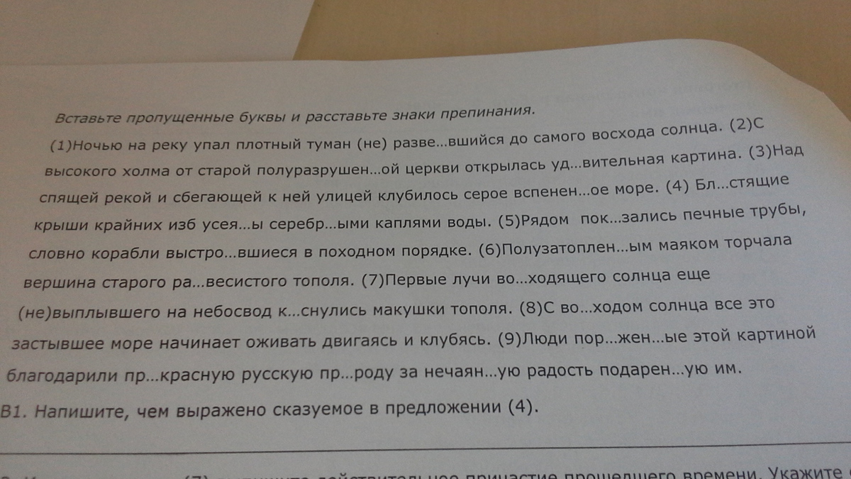 ночью на реку упал плотный туман, не развеявшийся до самого восхода солнца. с высокого холма от старой полуразрушенной церкви открылась удивительная картина. над спящей рекой и сбегающей к ней улице клубилось серое вспененное море.блестящие крыши крайних изб усеяны серебряными каплями воды. рядом показались печные трубы, словно корабли выстроившиеся в походном порядке. полузатопленным маяком торчала вершина старого развесистого тополя. первые лучи восходящего солнца еще не выплывшего на небосвод коснулись макушки тополя. с восходом солнца все это застывшее море начинает оживать двигаясь и клубясь. пораженные этой картиной благодарили прекрасную русскую природу за нечаянную радость подаренную им. 4) усеянные именное сказуемое