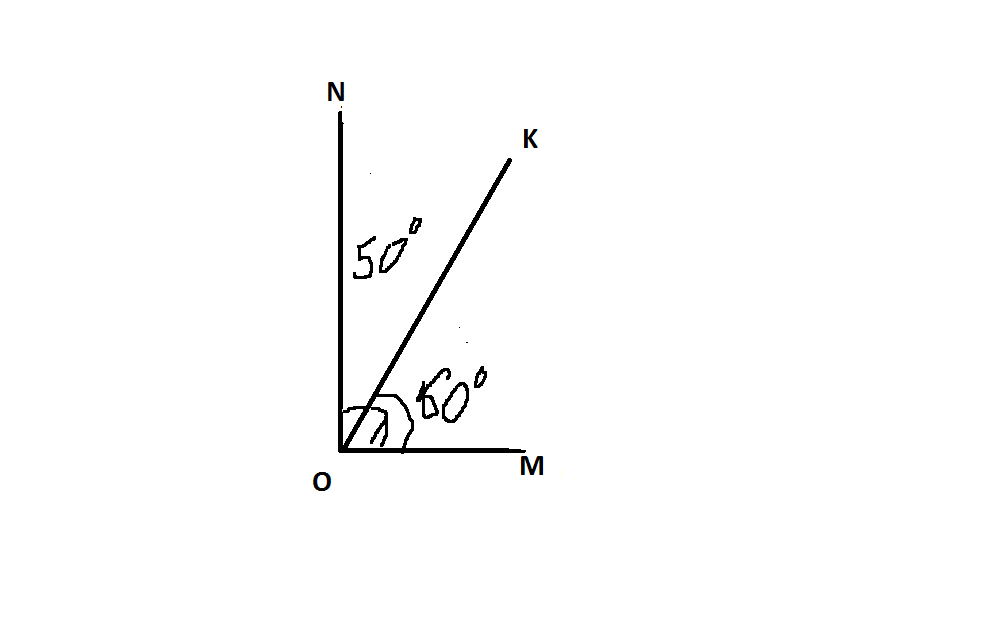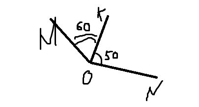Угол MON = KOM + KON = 50 + 60 = 110 градусов. Значит, угол MON- тупой.
