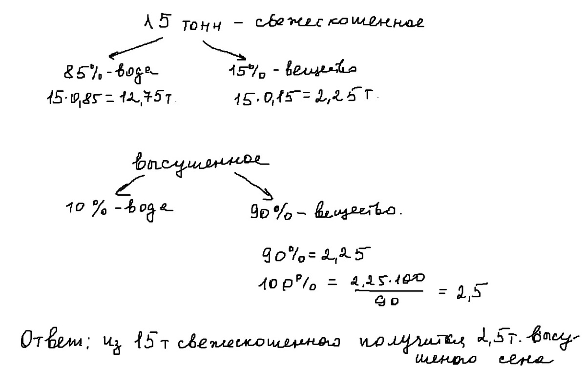 Влажность свежескошенного сена равна 85%. А высушенного 10%. Сколько высушенного сена получится из 15 тонн свежескошенного?