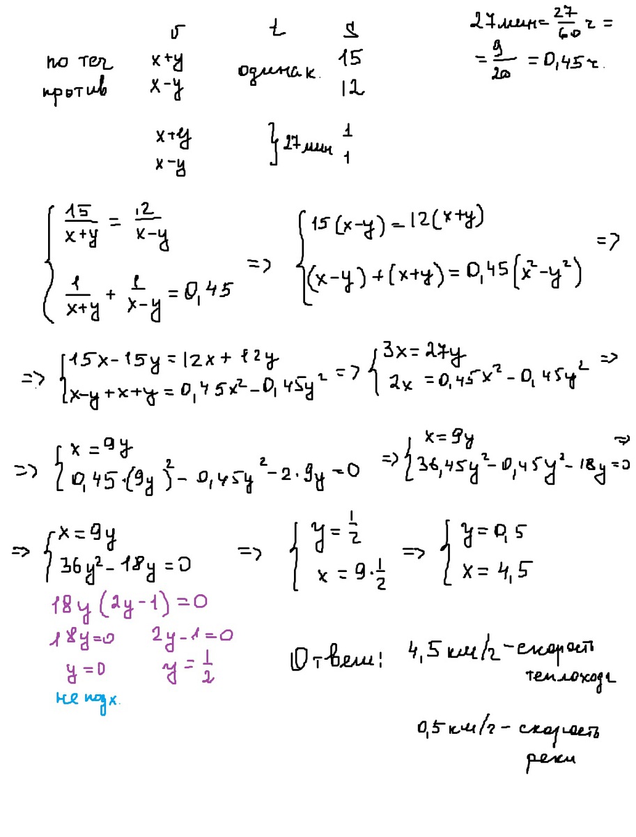 Човен проходить 15 км за течією річки за той самий час,що й 12 км проти течії.Чому дорівнює швидкість течії,якщо 1 км за течією і 1 км проти течії човен проходить за 27 хв?