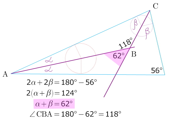 Один из углов треугольника равен 56 градусов . Найти острый угол , который образован биссектрисами двух других углов треугольника .