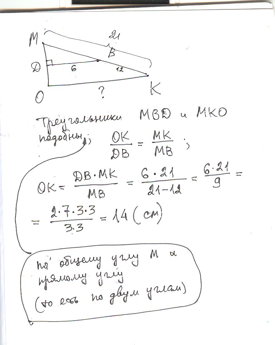 В прямоугольном треугольнике MOK из точки В гипотенузы МК проведен перпендикуляр ВD к стороне МО . Найдите длину катета ОК,если BD =6, МК = 21см ,ВК = 12