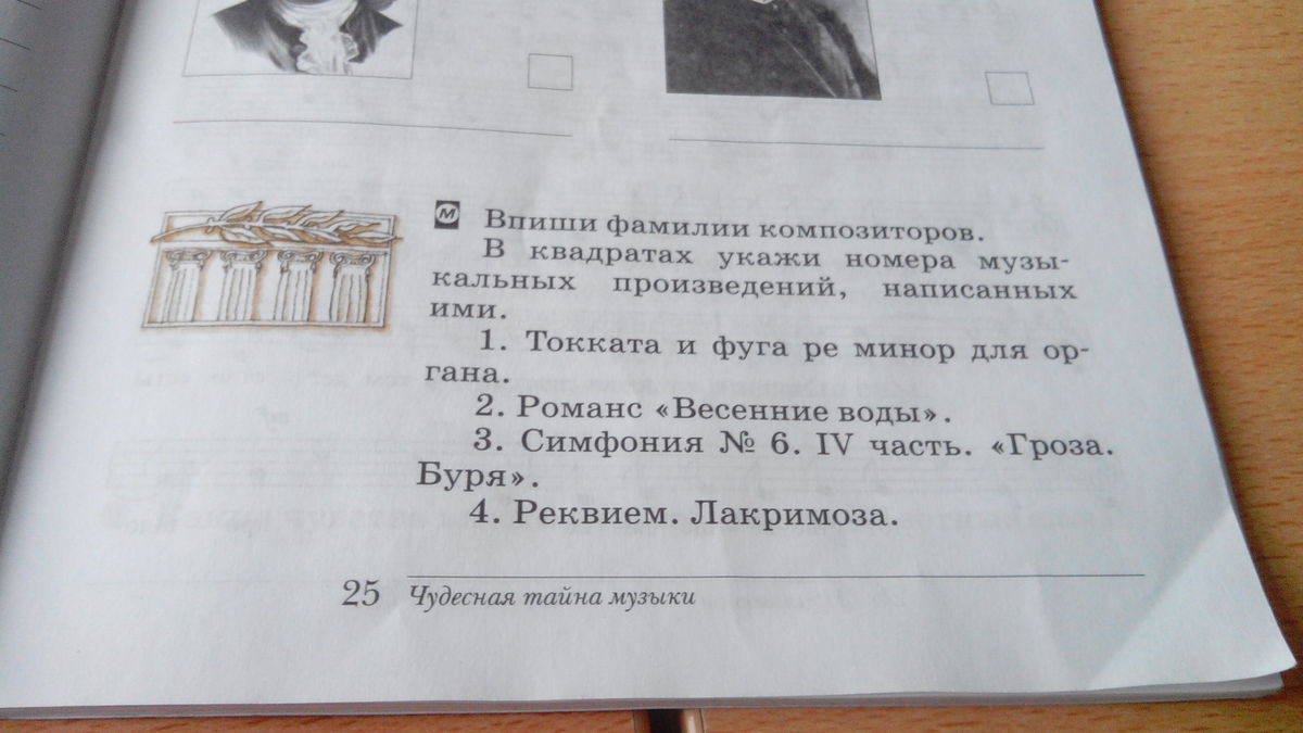 Выпиши фамилии композиторов. В квадратах укажи номера мызыкальный произведений, написанных ими.