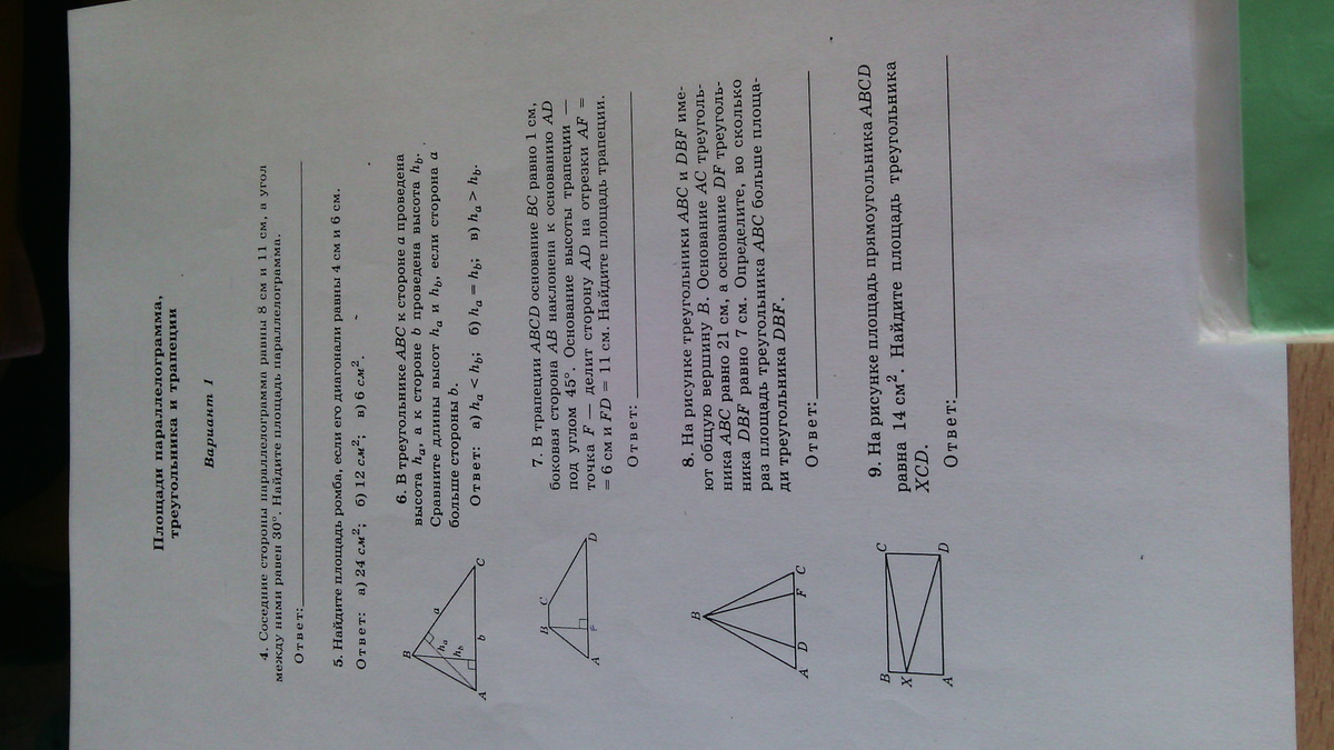 8. высота одинаковая, площадь половина произведения высоты на сторону, к которой она проведена. 21/7=3 ответ: площадь АВС больше в три раза