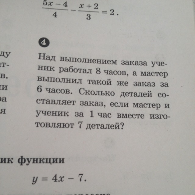 Над выполнением заказа ученик работал 8 часов, а мастер выполнил такой же заказ за 6 часов. Сколько деталей составляет заказ, если мастер и ученик за 1 час вместе изготовляют 7 деталей !? Помогите пож срочно !!