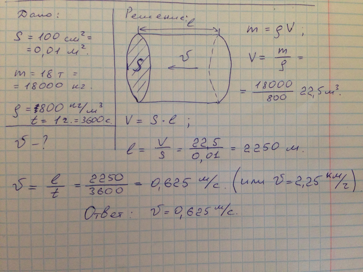 С какой постоянной скоростью должна двигаться нефть в трубопроводе с площадью сечения 100 см2,чтобы в течение часа проникло 18т нефти?Решение с дано.Срочно!!!