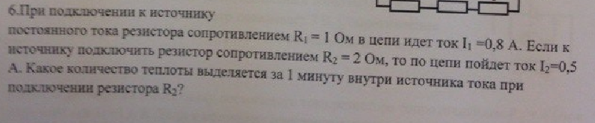 при подключении к источнику. при подключении к источнику постоянного тока резистора с сопротивлением 1 ом сила тока равна 0,8 А, а при сопротивлении 2 ом составляет 0,5 А.