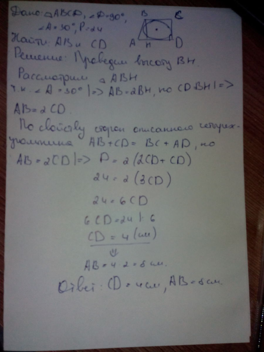 В прямоугольную трапецию ABCD вписана окружность (AD и BC- основания) CD перпендикулярна AD , угол А=30 градусов . Периметр трапеции равен 24 см. Чему равны стороны АВ и CD.