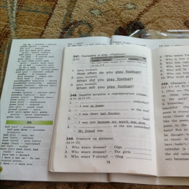 249: 1) olga wears dresses 2) the girls wear dresses 3) oleg wears t-shirts