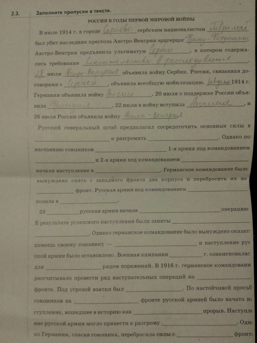 В июне 1914 г. в боснийском городе Сараево сербским националистом Гаврилой Принципом был убит наследник престола Австро-Венгрии эрцгерцог Франц-Фердинанд. Австро-Венгрия предъявила ультиматум Сербии, в котором содержались требования о допущении австрийских следователей на территорию Сербии и введении ограниченного контингента австрийских войск. 27 июля Австро-Венгрия объявила войну Сербии. Россия, связанная договорами с Сербией, объявила всеобщую мобилизацию. 1 августа 1914 г. Германия объявила войну России. Одновременно германские войска вторглись на территорию Бельгии и Франции. Русский генеральный штаб считал опасным предоставить Германии возможность разгромить Франции. И поэтому планировал одновременное наступление на Берлин и на Вену. Однако по настоянию союзников 1-я армия под командованием П.К. Ренненкампфа и 2-я армия под командованием А.В. Самсонова начали наступление в Восточной Пруссии. Германское командование было вынуждено снять с западного фронта два корпуса и перебросить их на восточный фронт. Русская армия под командованием А.В. Самсонова попала в окружение. Таким образом, военная кампания 1914 г. ознаменовалась для России рядом поражений.