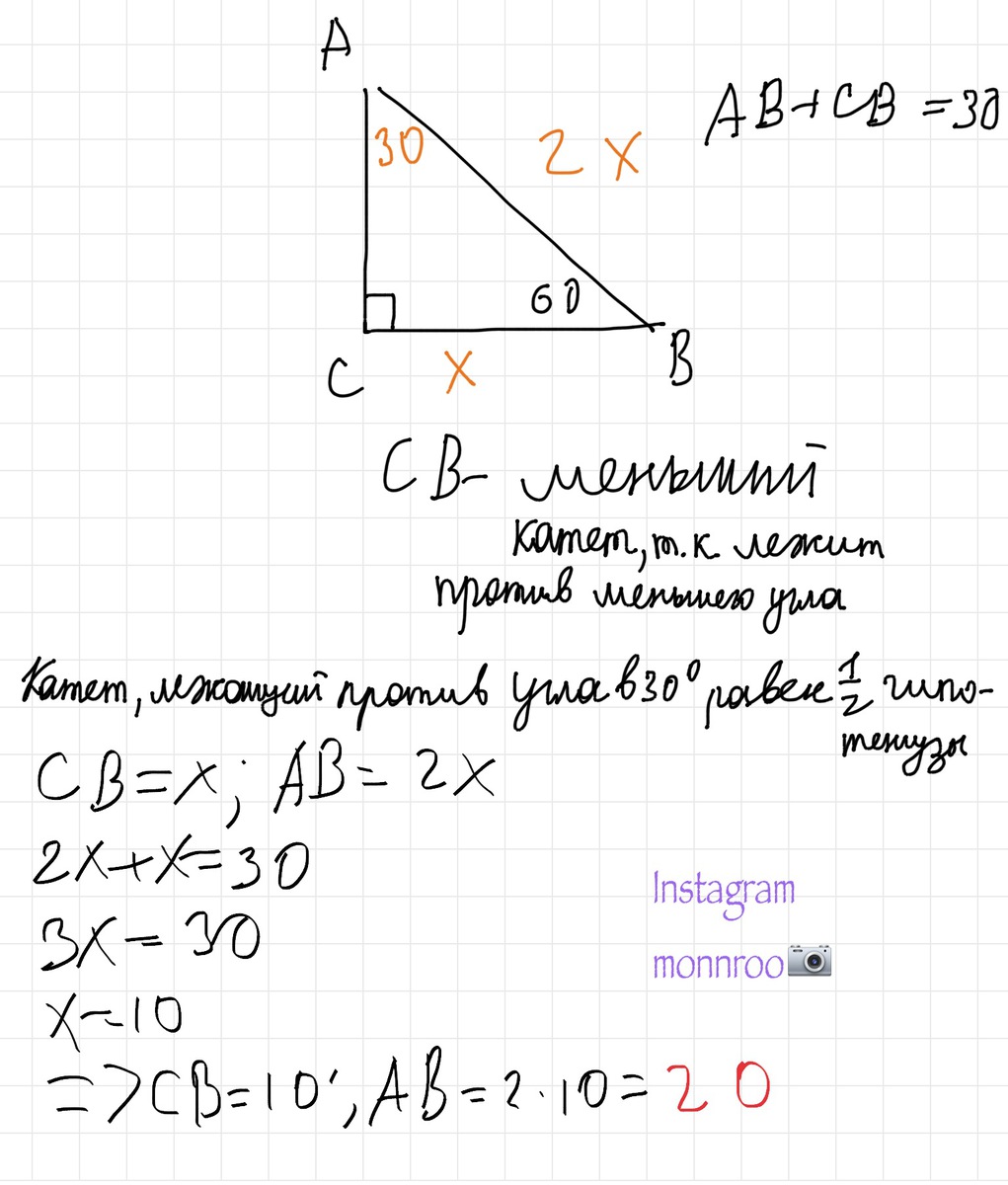 один из углов прямоугольного треугольника равен 60 градусов,а сумма гипотенузы и меньшего из катетов равна 30 см.Найдите гипотенузу треугольника.ЖЕЛАТЕЛЬНО СХЕМУ!!!