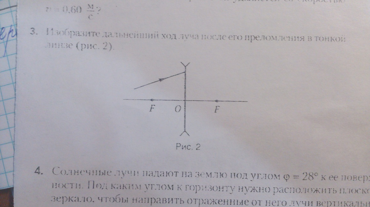Изобразите дальнейший ход луча после его преломления в рассеивающей тонкой линзе