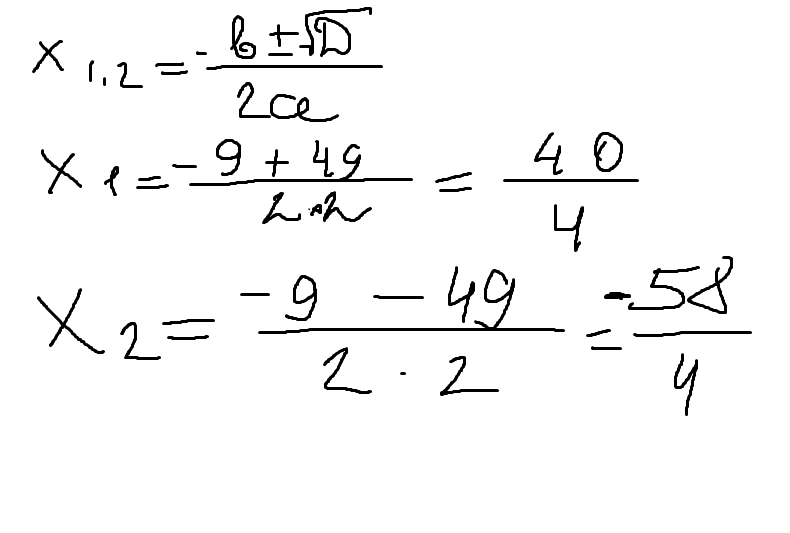 x1=(-b-корень из D):2a=(-9-7):4=-4