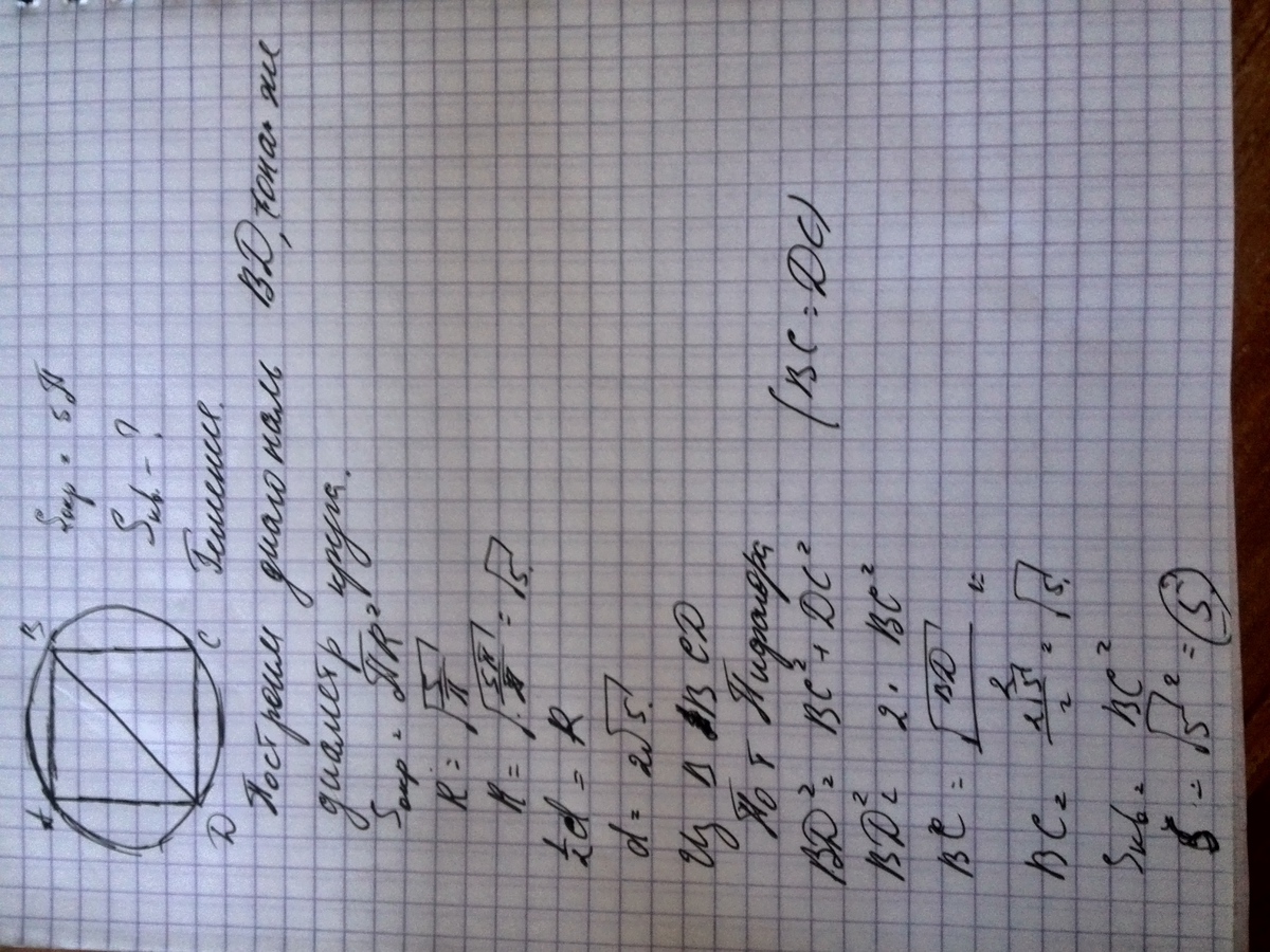 площадь круга, описанного вокруг правильного квадрата , равна 5П. найдите площадь этого квадрата.