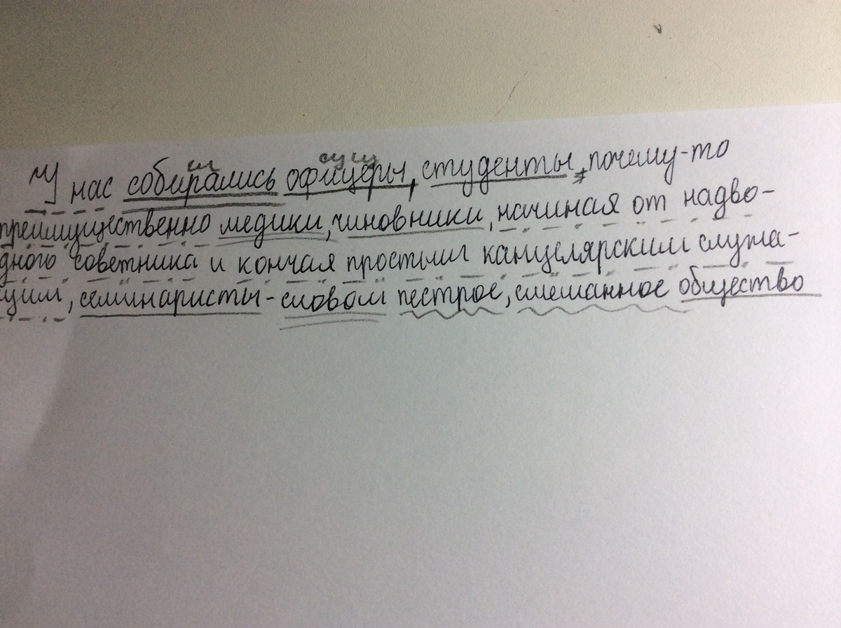 У нас собирались офицеры, студенты почему-то преимущественно медики, чиновники, начиная от надводного советника и кончая простым канцелярским служащим, семинаристы-словом пестрое, смешанное общество. синтаксический разбор