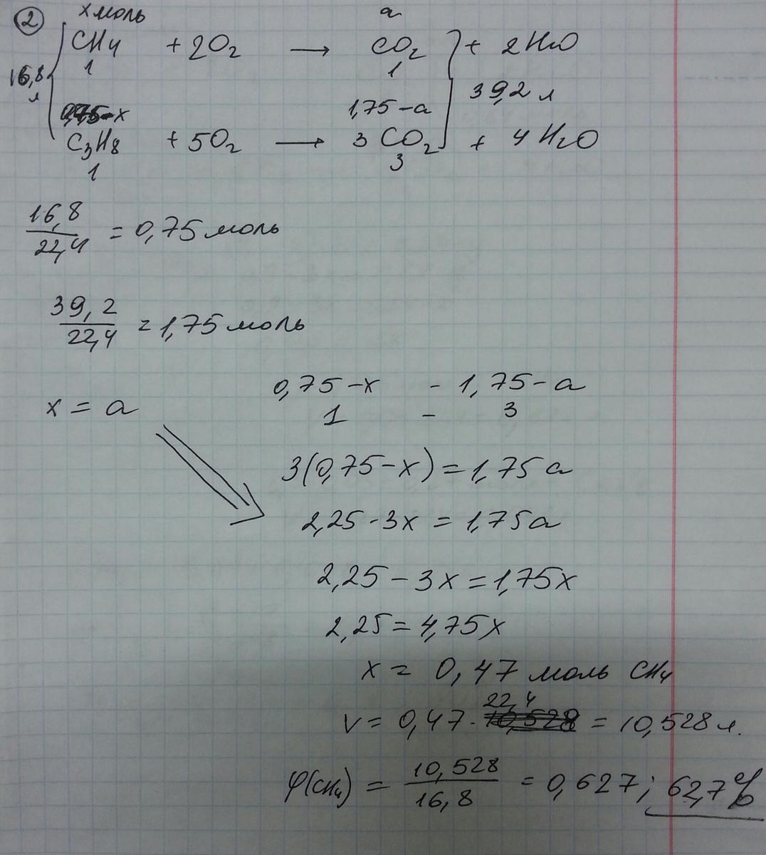 2)При сгорании смеси метана и пропана объёмом 16,8 получили CO2 объёмом 39,2. Вычислит объёмную долю метана в смеси.