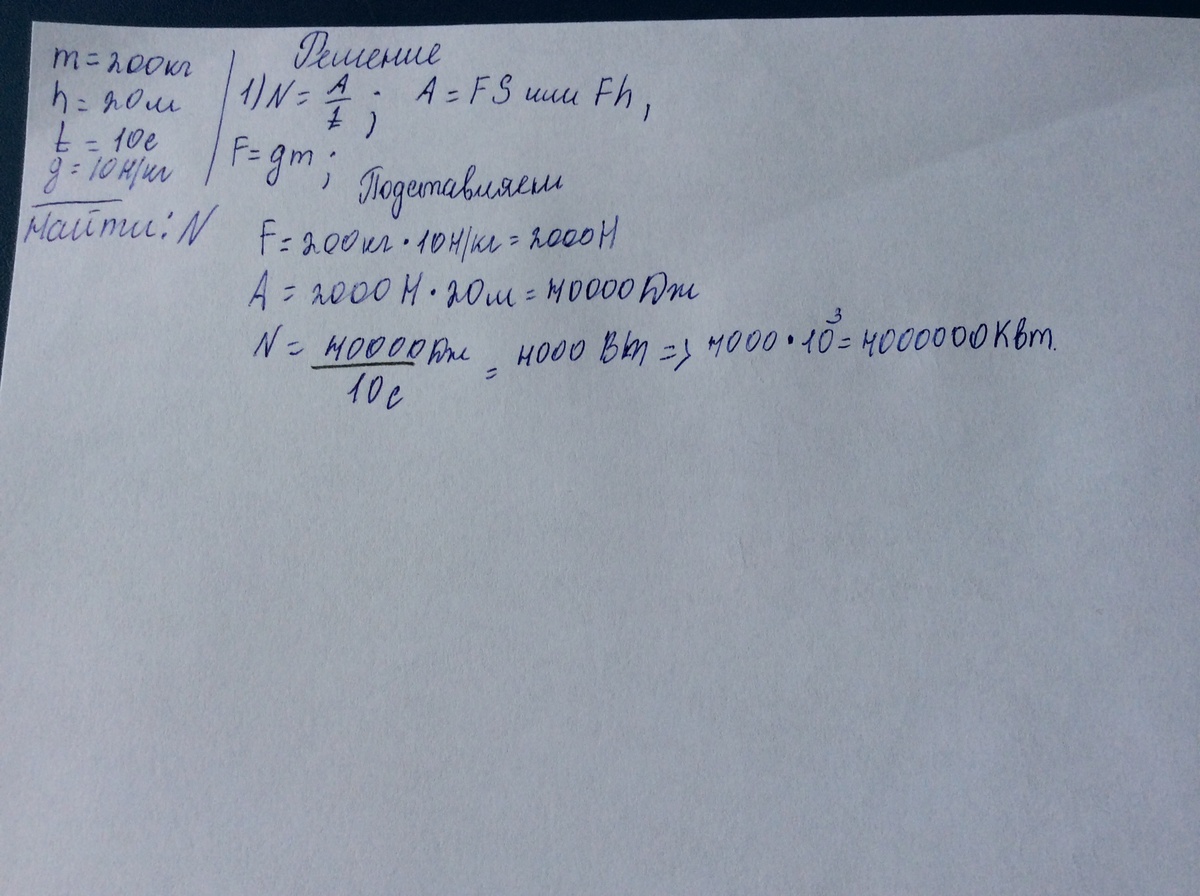 Помогите с Задачей(((( Прошу((((Подъёмный кран поднимает равномерно груз массой 200кг на высоту 20м за 10с. Какую мощность развивает подъёмный кран? Ответ нужно представить в кВт.