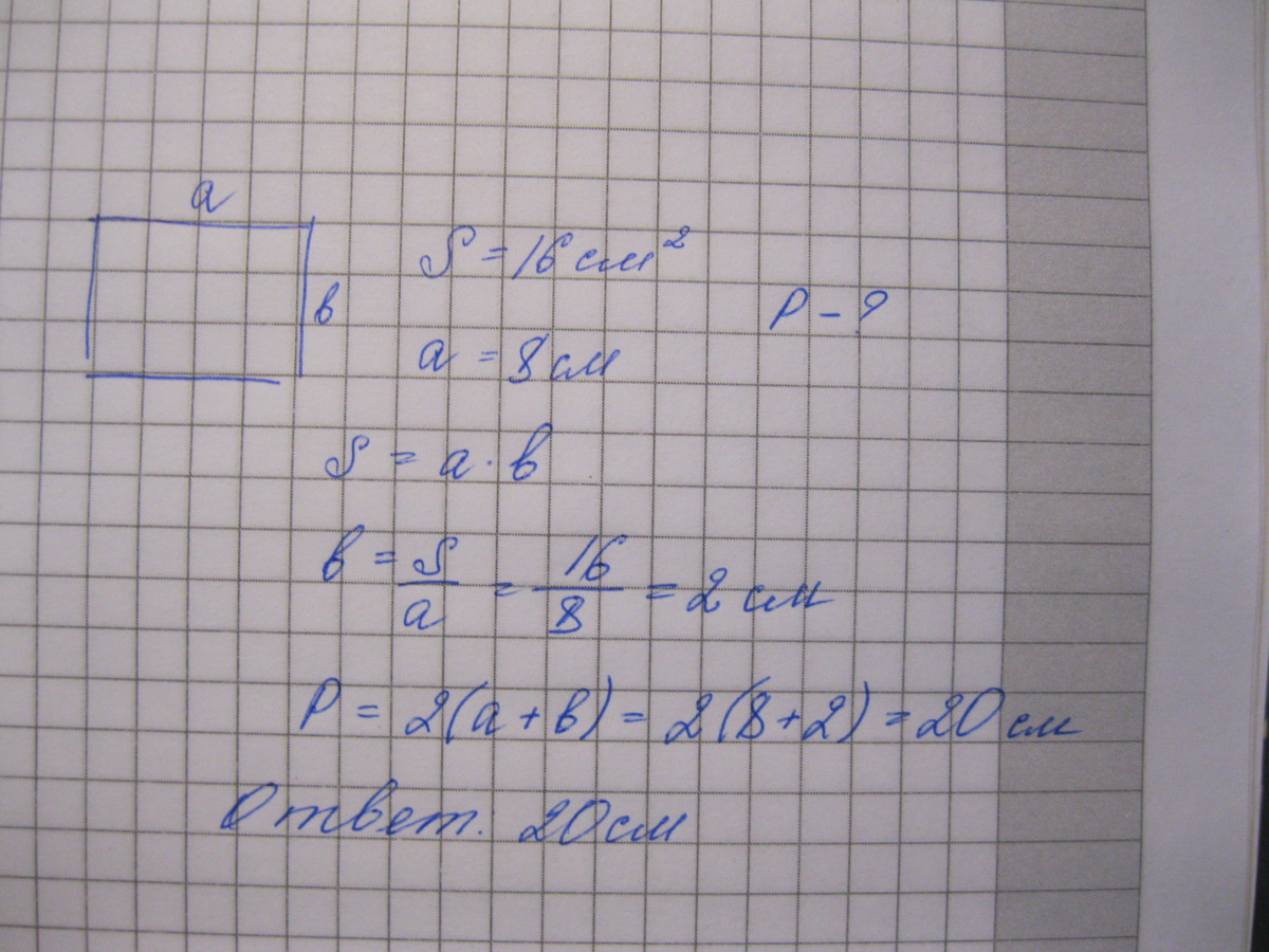начерти прямоугольник площадь которого равна16см2 а длина одной стороны-8см. найди его периметр