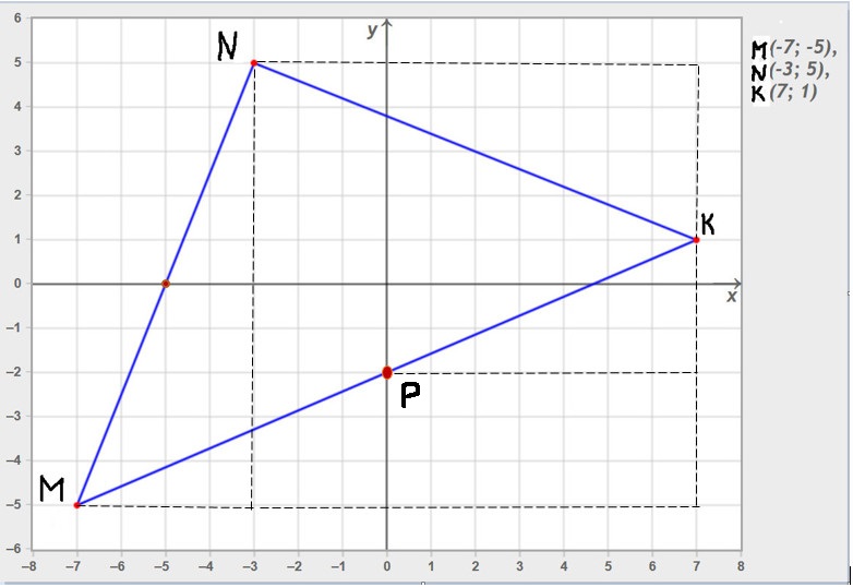 постройте в координатной плоскости треугольник MKN если M-7;-5 N-3;5 K7;1 измерьте углы и стороны этого треугольника найдите координаты середины стороны MN рисунок плиз)