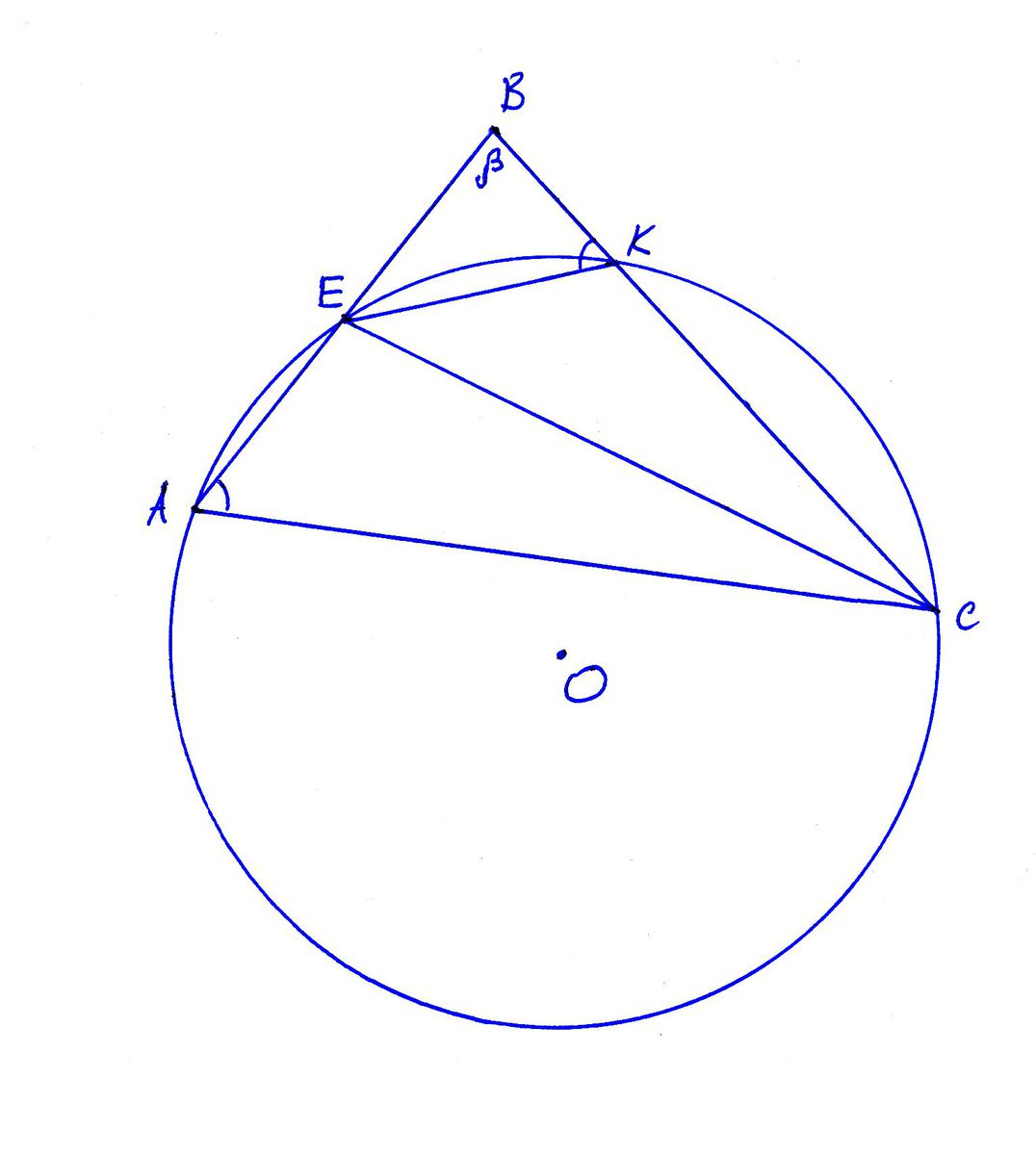 Кроме того, подобие треугольников ABC и KBE при любом значении β ВСЁ РАВНО означает, что вокруг четырехугольника AEKC можно описать окружность Правда, радиус этой окружности зависит от угла ABC = β. Но из последнего соотношения видно, что этот радиус пропорционален стороне AB = c. Что означает, что из условия задачи И НЕЛЬЗЯ определить, чему равен β.