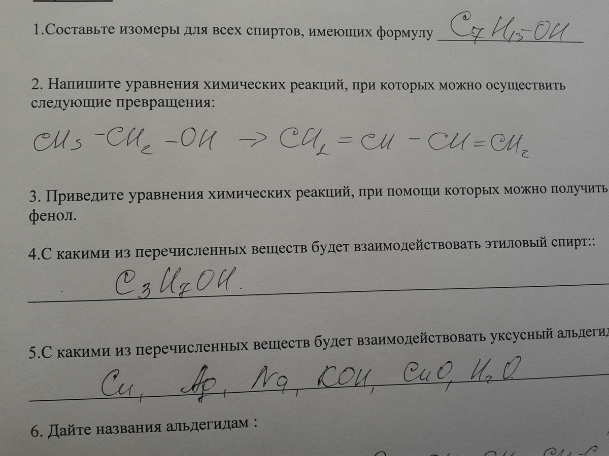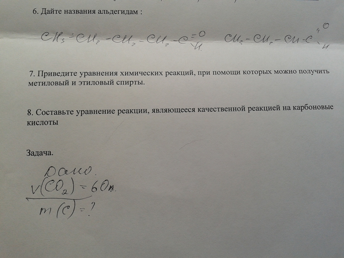 6) 1)пентаналь 2) бутаналь ; 7)2СН4+О2=2СH3OH ;8) 1. Реакция на лакмус - Для карбоновых кислот, характерна отчетливая реакция на лакмус - красное окрашивание