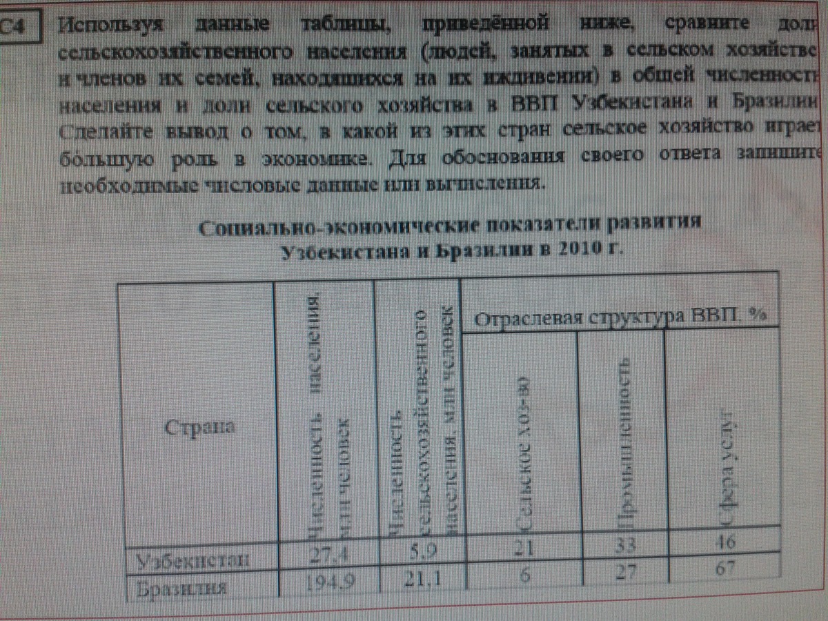 2. Доля сельскохозяйственного населения в общей численности населения в Узбекистане (5,9:27,4Х100%= 21,5) больше, чем в Бразилии (21,1:194,9Х100%=10,8)